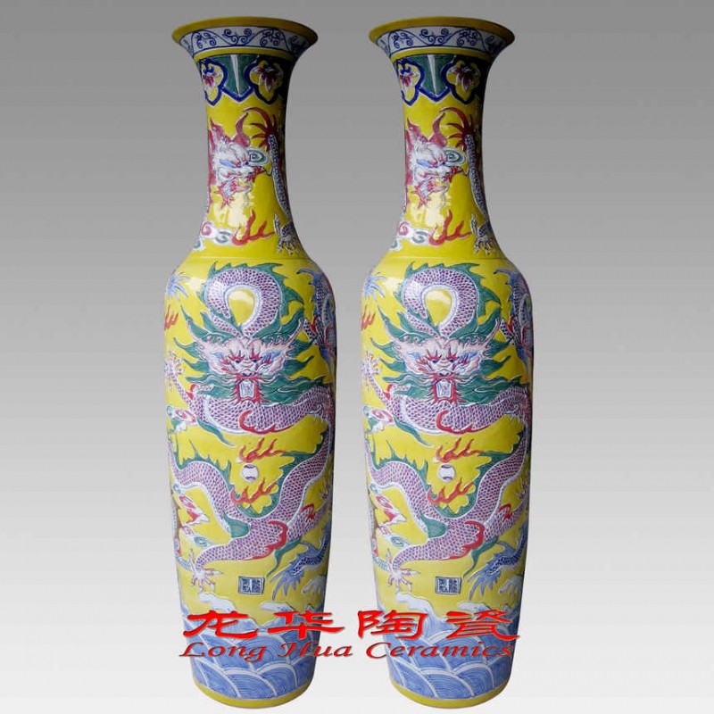 陶瓷大花瓶是景德镇大型瓷器种类中的一种。大花瓶的最大特点就是“大”,摆放出来一眼就能看见,特别醒目,欣赏率高。因为花瓶规格大所以显得大器,特别适合各种商务活动礼品的赠送。这种大规格的瓷器花瓶(规格1.8米-3.5米)之间的摆放在大堂、大厅尤其彰显气派。而这种落地花瓶规格在1.6米-1米左右的适合摆放在现代商品房电视背景墙两旁的装饰。