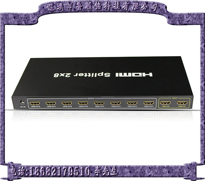 鲁顺铭这款带切换功能的HDMI分配器2进8出(hdmi splitter 2x8)能够轻松地将两个HDMI高清信号源选择切换并且分配到八个高清显示终端。是一款HDMI分配器与切换器的组合设备,也可以叫hdmi矩阵切换器同时,把它接在一根较长的HDMI线的信号输出端时,可对HDMI信号进行放大以再生。