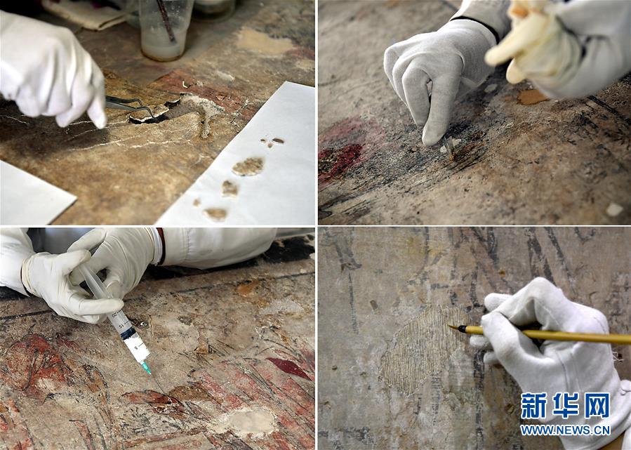 千年古都“烹制”洛阳博物馆日期:2019-05-19 点击:147 展开全部 查看原图左上:洛阳古代艺术博物馆壁画修复中心的壁画修复师对壁画进行碎块拼对;右上:壁画修复师对壁画表面缺失处进行填补;左下:壁画修复师对壁画进行表面碎块加固;右下:壁画修复师对壁画填补处着色(拼版照片,2017年5月16日摄)。