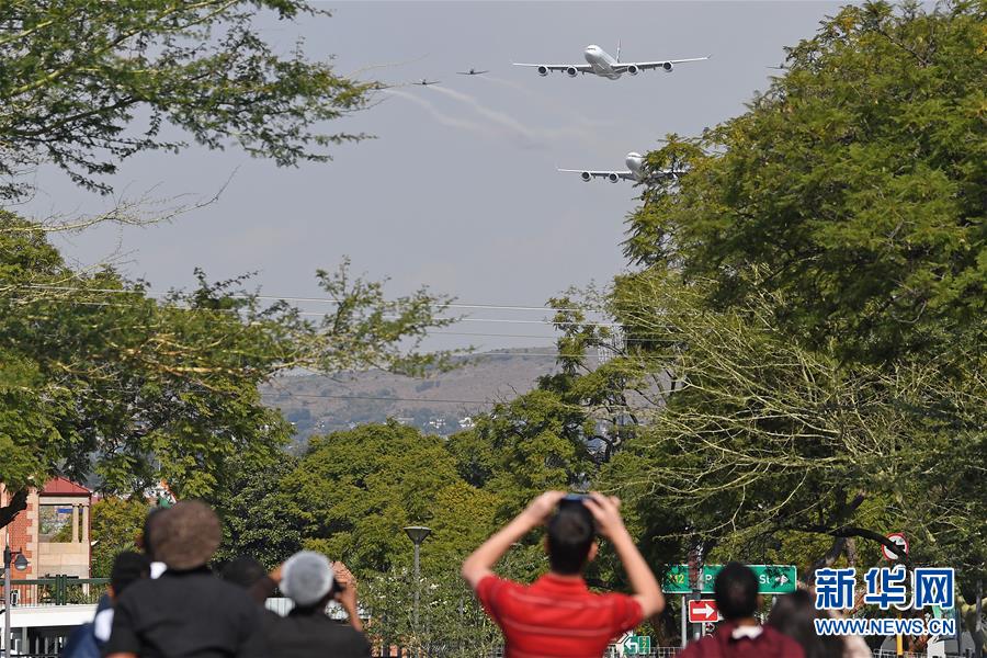 这是5月25日在南非比勒陀利亚新任总统就职仪式上拍摄的飞行表演。
