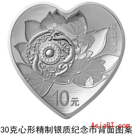 30克心形银质“珠联璧合”纪念币背面图案为玉璧、宝珠、荷花等组合图案,并刊“珠联璧合”字样及面额。