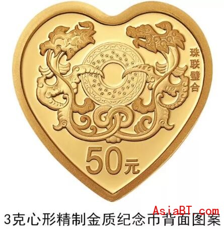 3克心形金质“珠联璧合”纪念币背面图案为龙、凤、玉璧等组合图案,并刊“珠联璧合”字样及面额。