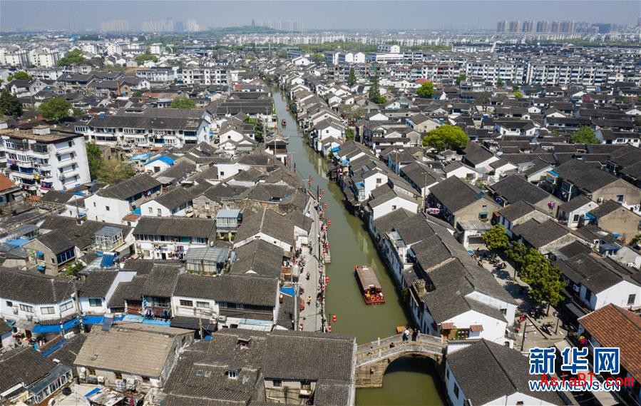 图为4月18日无人机拍摄的苏州山塘街及城景。