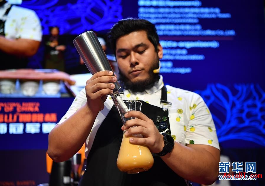 6月4日,中国台湾咖啡师赖孟忻在调制咖啡。 当日,第八届中国福山咖啡杯国际咖啡师冠军赛在海南省澄迈县举行,23位国内外选手共聚福山咖啡文化风情镇,切磋、交流咖啡技艺。 新华社记者 郭程 摄