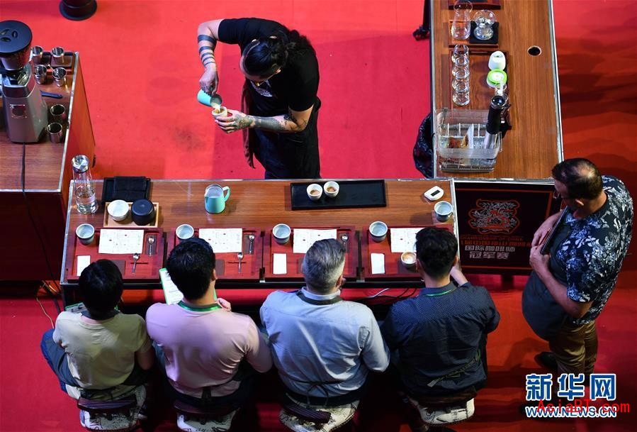 6月4日,中国台湾咖啡师赖孟忻在调制咖啡。 当日,第八届中国福山咖啡杯国际咖啡师冠军赛在海南省澄迈县举行,23位国内外选手共聚福山咖啡文化风情镇,切磋、交流咖啡技艺。 新华社记者 郭程 摄