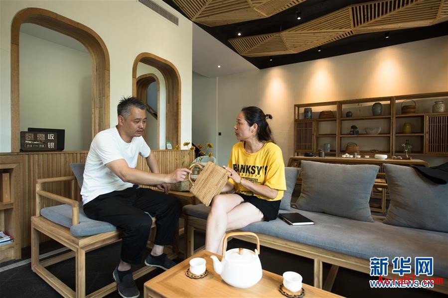 在万载古城的一家以手工艺品为主题的民宿内,住客在天井欣赏手工艺品(6月6日无人机拍摄)。 近年来,江西省万载县大力推进文旅融合,充分利用万载古城祠堂集群优势,以特色民宿为依托,打造以传统手工艺、文化创意、美食餐饮、休闲娱乐为主的旅游文化,吸引游客“愿留下”“尽兴玩”。 新华社记者 彭昭之 摄