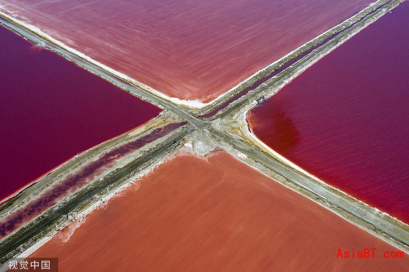 当地时间2019年6月11日,航拍纳米比亚沃尔维斯湾五彩盐田。盐田总面积达3500公顷(35平方千米),南非近90%的盐都由该地供应,盐田中生长的海藻和盐浓度不同造成盐田呈现出多种色彩,照片由自由摄影师Franco Cappellari使用无人机拍摄。