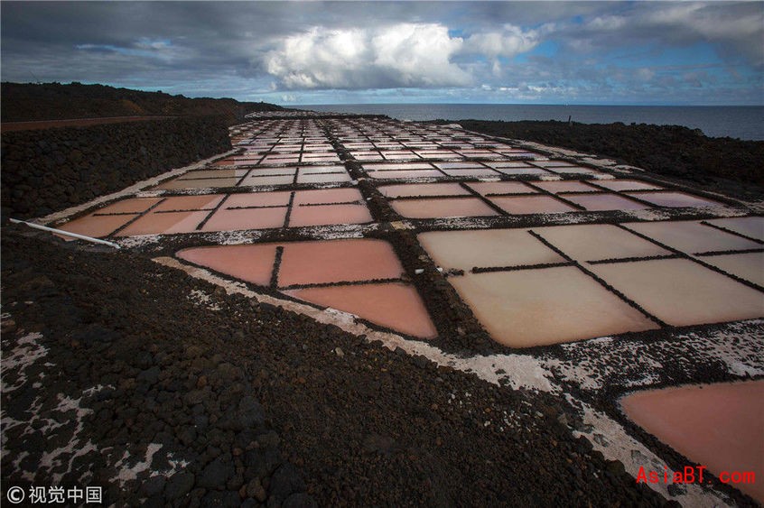 当地时间2019年6月11日,航拍纳米比亚沃尔维斯湾五彩盐田。盐田总面积达3500公顷(35平方千米),南非近90%的盐都由该地供应,盐田中生长的海藻和盐浓度不同造成盐田呈现出多种色彩,照片由自由摄影师Franco Cappellari使用无人机拍摄。