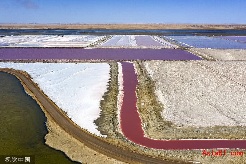 当地时间2019年6月11日,航拍纳米比亚沃尔维斯湾五彩盐田。盐田总面积达3500公顷(35平方千米),南非近90%的盐都由该地供应,盐田中生长的海藻和盐浓度不同造成盐田呈现出多种色彩,照片由自由摄影师Franco Cappellari使用无人机拍摄。