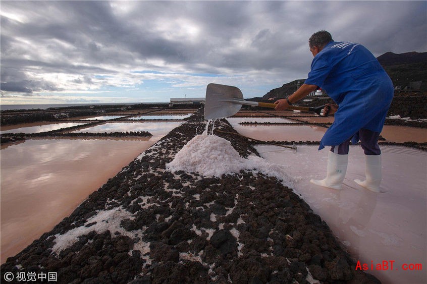 当地时间2019年6月11日,航拍纳米比亚沃尔维斯湾五彩盐田。盐田总面积达3500公顷(35平方千米),南非近90%的盐都由该地供应,盐田中生长的海藻和盐浓度不同造成盐田呈现出多种色彩,照片由自由摄影师Franco Cappellari使用无人机拍摄。