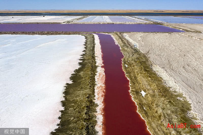 当地时间2019年6月11日,航拍纳米比亚沃尔维斯湾五彩盐田。盐田总面积达3500公顷(35平方千米),南非近90%的盐都由该地供应,盐田中生长的海藻和盐浓度不同造成盐田呈现出多种色彩,照片由自由摄影师Franco Cappellari使用无人机拍摄。
