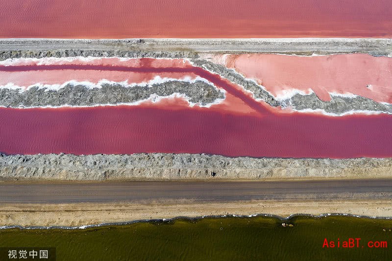 当地时间2019年6月11日,航拍纳米比亚沃尔维斯湾五彩盐田。盐田总面积达3500公顷(35平方千米),南非近90%的盐都由该地供应,盐田中生长的海藻和盐浓度不同造成盐田呈现出多种色彩,照片由自由摄影师Franco Cappellari使用无人机拍摄。