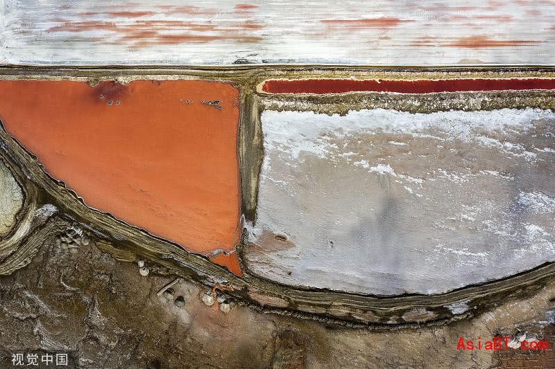 当地时间2019年6月11日,航拍纳米比亚沃尔维斯湾五彩盐田。盐田总面积达3500公顷(35平方千米),南非近90%的盐都由该地供应,盐田中生长的海藻和盐浓度不同造成盐田呈现出多种色彩,照片由自由摄影师Franco Cappellari使用无人机拍摄。