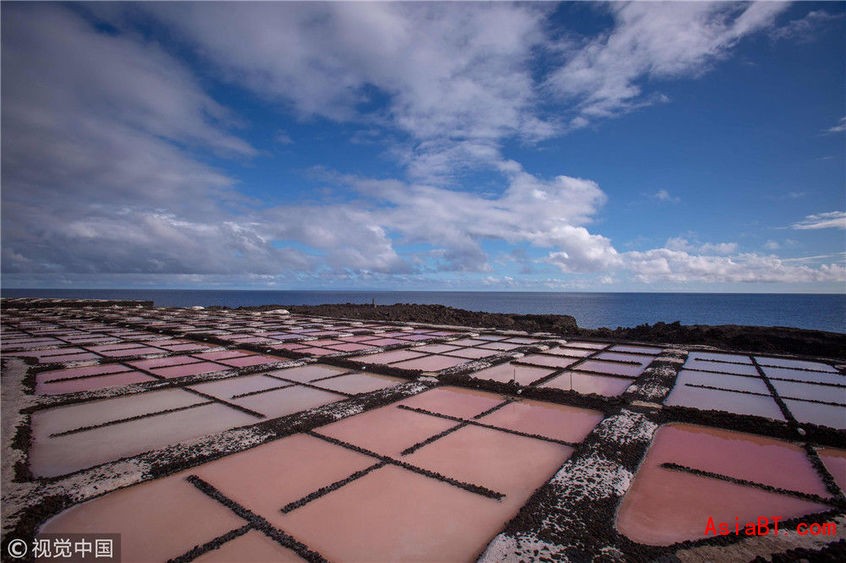 当地时间2019年6月11日,航拍纳米比亚沃尔维斯湾五彩盐田。盐田总面积达3500公顷(35平方千米),南非近90%的盐都由该地供应,盐田中生长的海藻和盐浓度不同造成盐田呈现出多种色彩,照片由自由摄影师Franco Cappellari使用无人机拍摄。