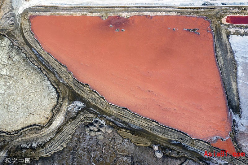 当地时间2019年6月11日,航拍纳米比亚沃尔维斯湾五彩盐田。盐田总面积达3500公顷(35平方千米),南非近90%的盐都由该地供应,盐田中生长的海藻和盐浓度不同造成盐田呈现出多种色彩,照片由自由摄影师Franco Cappellari使用无人机拍摄。