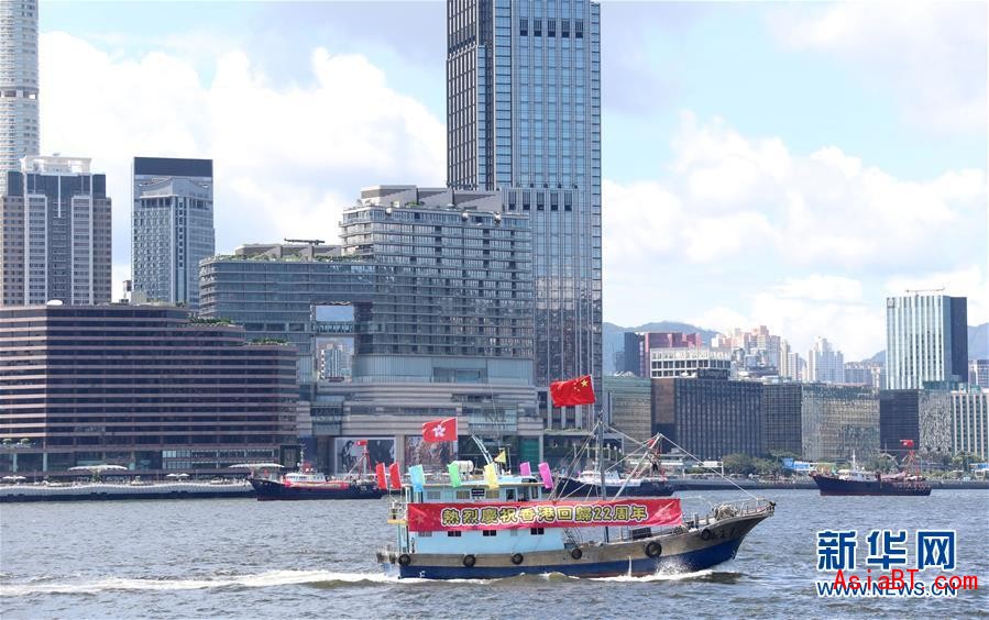 7月1日,香港渔民团体联会的70艘渔船插满鲜艳的国旗、区旗和庆祝标语,在维多利亚港巡游,庆祝香港回归祖国22周年。