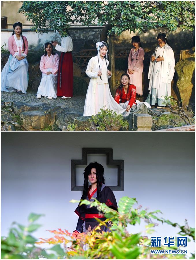 这张拼版照片展示的是:上图,2019年4月1日,游客在中国苏州耦园内身着古装拍照(新华社记者杜涓涓摄);下图,2019年4月13日,一名当地游客在德国曼海姆中式园林“多景园”内身着古装拍照(新华社记者逯阳摄)。